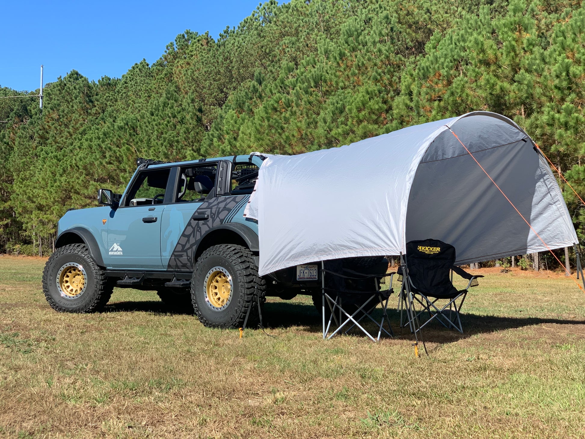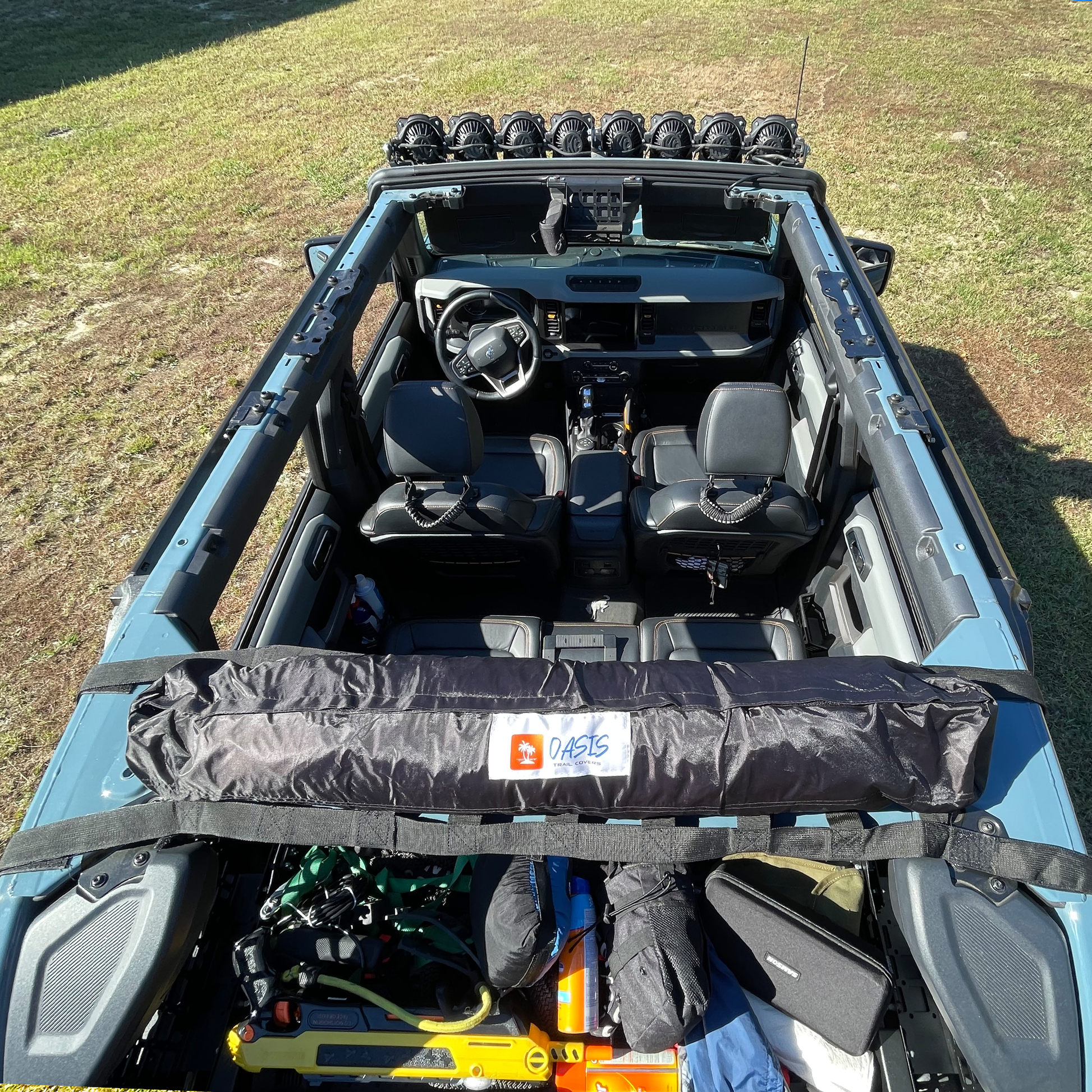 This Trail Gear Oasis Product is designed around 2020- Present Ford Bronco Soft Top Models Only. The Product can live on the roll bar with your top on and can be used as a tailgate shade with top still on vehicle. What Comes With It: One Trail Gear Oasis Bag With Tailgate Tent & Rain Cover; Ground Screw Spikes (bag of 6); Collapsible Tent Pole; Straps and Hooks; 6 Fillable Sandbags